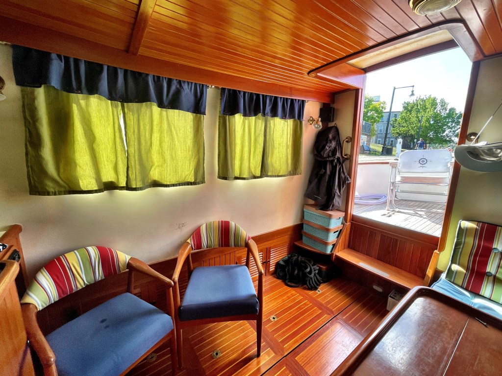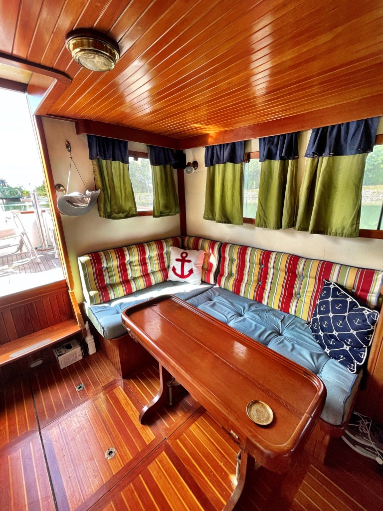 When I bought the boat it had 30 year old blue velour fabric on everything. One of my first big projects was reupholstering. Fortunately Lillie, my sister in law, was onboard and we spent many Winter weekends replacing that 1980’s velour and it turned out great.