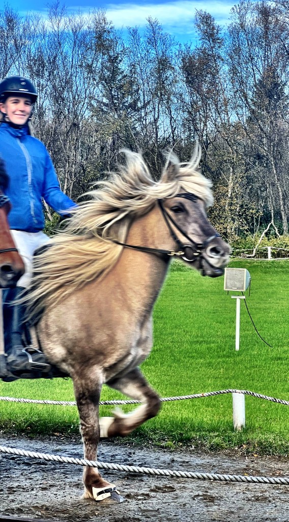 The natural gait of the Icelandic horse is fascinating. Most horses walk, trot and gallop. The Icelandic horse also has a Pace and Amble gait that are beautiful things to watch. Unlike the Tennessee Walking horse that is abused into its special gait, the Icelandic horse does all 5 gaits naturally.