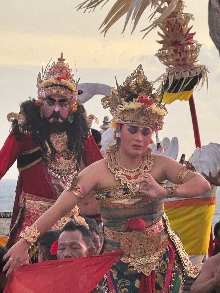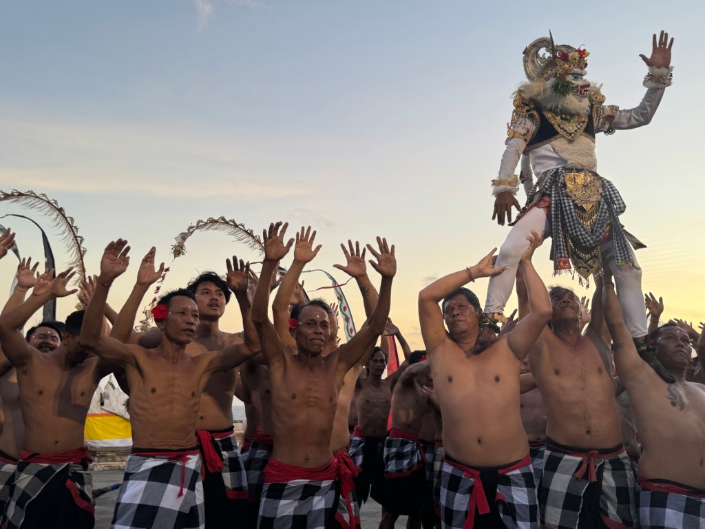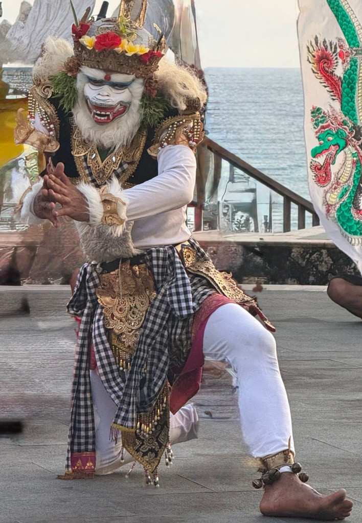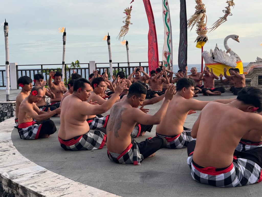 The setting for the Kecak Fire Dance Ceremony was at the shore of the Indian Ocean at sunset. The male dancers made this clacking sound that they impressively managed to keep for an hour.